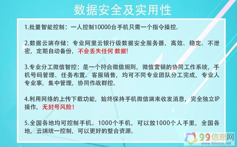 云控是采用阿里云的服务器,手机跟电脑不需要通过USB作连接,主要是通过网络通讯来实现对手机的控制,云控的优势就是手机只要有电有网络在任意地方都可以实现被控制,并且控制手机数量是没有上限的,几百几千部手机都可以9.9.x.i.n.x.i.n.e.t。采用独加技术实现全程模拟人工手动点击操作,手机不用装任何框架,没有破坏微星的任何生态,均是官方正版微星,在手机应用市场吓载即可实现控制,安全稳定,只要按照微星规则操作加粉发圈,不会出现封号的风险。