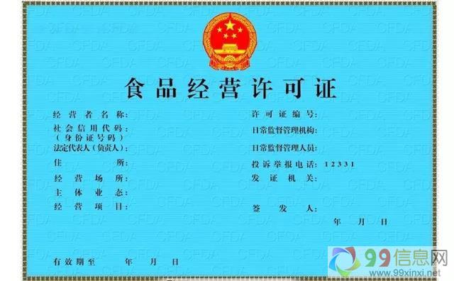 在食品经营许可证上,应该明确印上的内容有:经营者名称、社会信用代码(个体经营者为身份证号码)、法定代表人(负责人)、住所、经营场所、主体业态、经营项目、许可证编号、有效期、日常监督管理机构、日常监督管理人员、投诉举报电话、发证机关、签发人、发证日期和二维码。食品经营许可证上有一个编号,前面是“经营”两个字的汉语拼音首字母,“JY”,后面是14位阿拉伯数字99信息网www.99xinxi.net。从左到右的含义分别是:1位主体业态代码、2位省(自