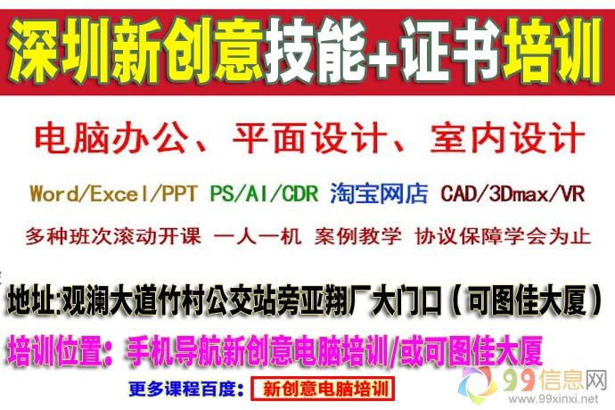 深圳观澜零基础平面设计、CAD、电脑办公培训学校,新创意始终以实战,以企业需求为目标,设计培训课程体系为经营宗旨9 9 信 息 网。本着对学员,家长,企业负责的精神,致力于为社会培养更多、更实用、更优秀的专业实用性人才,提升就业竞争力,确保学员学有所成,学以致用。在学习的同时积累经验,用作品体现直接的价值