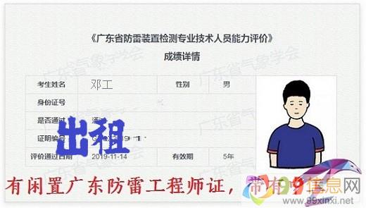 另持有中级工程师软考证书,寻广东省防雷检测公司兼职,可以配合公司防雷装置检测资质办理。能出场广东省附近地区。9 9 信 息 网